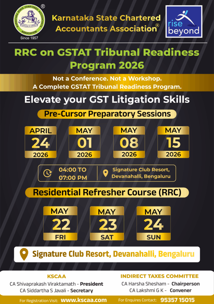 22/05/2026 9:30 am – 24/05/2026 5:00 pm Signature Club Resort – Bengaluru Ticket Type Price Cart Members Only | Double Occupancy| RRC on GSTAT Tribunal Readiness Program 2026 ₹27,140.00 Original price was: ₹27,140.00.₹23,600.00Current price is: ₹23,600.00. Prices include all taxes Read more Others | Double Occupancy| RRC on GSTAT Tribunal Readiness Program 2026 ₹31,860.00 Original price […]