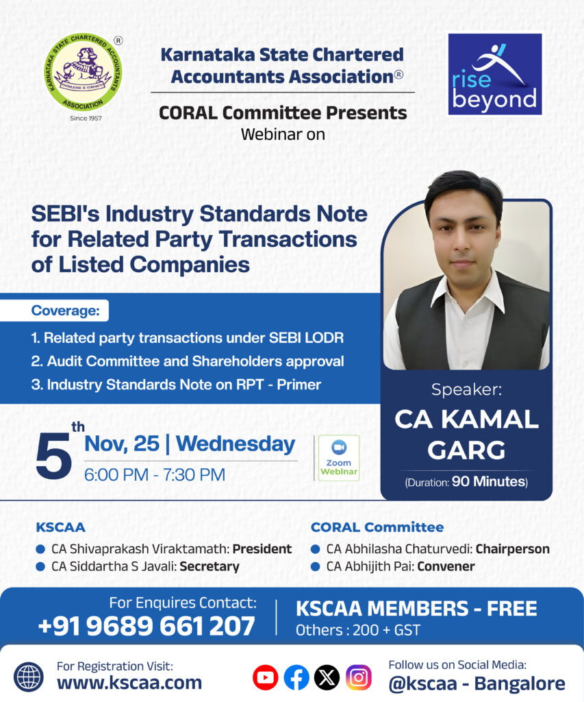 05/11/2025 6:00 pm – 7:30 pm Webinar Invitation | SEBI’s Industry Standards Note on Related Party Transactions of Listed Companies Karnataka State Chartered Accountants Association (KSCAA) – CORAL Committee is pleased to invite you to a focused and insightful webinar on“SEBI’s Industry Standards Note for Related Party Transactions of Listed Companies.” Date: Wednesday, 5th […]