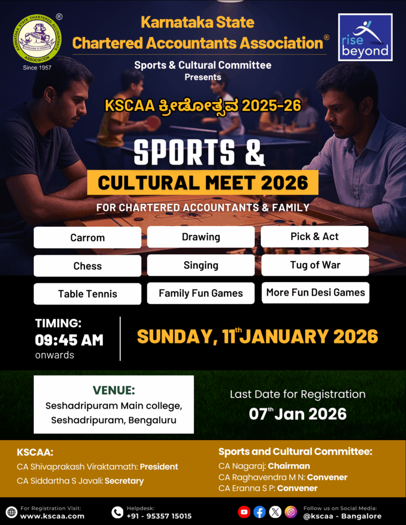 11/01/2026 9:45 am – 6:00 pm Seshadripuram Main College, 27, Nagappa Street, 4th Block, VV Giri Colony, Seshadripuram, Bengaluru, Karnataka 560020 KSCAA Sports & Cultural Meet 2025–26 The Karnataka State Chartered Accountants Association (KSCAA) cordially invites members and their families to a day of sports, culture, and camaraderie at the KSCAA Sports & Cultural Meet 2025–26. […]