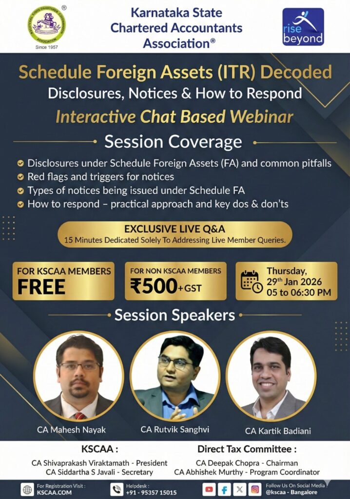 29/01/2026 5:00 pm – 6:30 pm Schedule Foreign Assets (ITR) Decoded | Disclosures • Notices • How to Respond With increasing notices under Schedule FA, one mistake can be costly. KSCAA brings an interactive webinar focusing on practical issues, red flags & real responses. Why attend? Avoid common disclosure errors Understand notice triggers Learn the […]